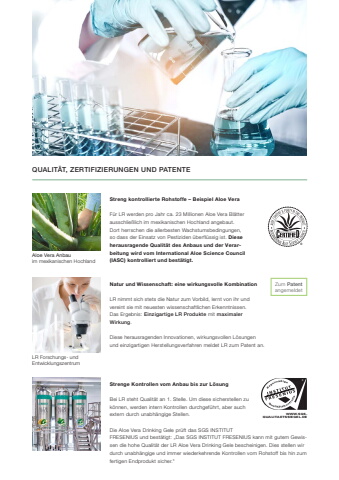 Streng kontrollierte Rohstoffe %u2013 Beispiel Aloe VeraF%u00fcr LR werden pro Jahr ca. 23 Millionen Aloe Vera Bl%u00e4tter ausschlie%u00dflich im mexikanischen Hochland angebaut. Dort herrschen die allerbesten Wachstumsbedingungen, so dass der Einsatz von Pestiziden %u00fcberfl%u00fcssig ist. Diese herausragende Qualit%u00e4t des Anbaus und der Verarbeitung wird vom International Aloe Science Council (IASC) kontrolliert und best%u00e4tigt.Strenge Kontrollen vom Anbau bis zur L%u00f6sungBei LR steht Qualit%u00e4t an 1. Stelle. Um diese sicherstellen zu k%u00f6nnen, werden intern Kontrollen durchgef%u00fchrt, aber auch extern durch unabh%u00e4ngige Stellen.Die Aloe Vera Drinking Gele pr%u00fcft das SGS INSTITUT FRESENIUS und best%u00e4tigt: %u201eDas SGS INSTITUT FRESENIUS kann mit gutem Gewissen die hohe Qualit%u00e4t der LR Aloe Vera Drinking Gele bescheinigen. Dies stellen wir durch unabh%u00e4ngige und immer wiederkehrende Kontrollen vom Rohstoff bis hin zum fertigen Endprodukt sicher.\Aloe Vera Anbau im mexikanischen HochlandLR Forschungs- und Entwicklungszentrum Zum PatentangemeldetNatur und Wissenschaft: eine wirkungsvolle KombinationLR nimmt sich stets die Natur zum Vorbild, lernt von ihr und vereint sie mit neuesten wissenschaftlichen Erkenntnissen. Das Ergebnis: Einzigartige LR Produkte mit maximaler Wirkung. Diese herausragenden Innovationen, wirkungsvollen L%u00f6sungen und einzigartigen Herstellungsverfahren meldet LR zum Patent an.QUALIT%u00c4T, ZERTIFIZIERUNGEN UND PATENTEWWW.SGSQUALITAETSSIEGEL.DE