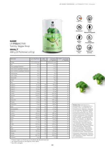 80GESUNDHEIT & ERN%u00c4HRUNGNAMELR FIGUACTIVEYummy Veggie SoupINHALT488 g (8 Portionen %u00e0 61g)N%u00e4hrwerte pro 100 g Pulver % NRV**, pro 100 gpro Portion (=1 Mahlzeit)% NRV**, pro Portion (=1 Mahlzeit)Energie 1471 kJ (350 kcal) 897 kJ (214 kcal)Fett 8,4 g 5,1 gdavon ges%u00e4ttigte Fetts%u00e4uren 5,1 g 3,1 gdavon einfach unges%u00e4ttigte Fetts%u00e4uren 1,1 g 0,7 gdavon mehrfach unges%u00e4ttigte Fetts%u00e4uren 2,2 g 1,3 gKohlenhydrate 30 g 18 gdavon Zucker 6,6 g 4,0 gBallaststoffe 16 g 9,8 gEiwei%u00df 31 g 19 gSalz 4,9 g 3,0 gVitamin A 541 %u03bcg 68 330 %u03bcg 41Vitamin D 3,0 %u03bcg 60 1,8 %u03bcg 37Vitamin E 6,9 mg 58 4,2 mg 35Vitamin C 88 mg 110 54 mg 67Thiamin 0,74 mg 67 0,45 mg 41Riboflavin 0,89 mg 64 0,54 mg 39Niacin 12 mg 75 7,4 mg 46Vitamin B6 1,4 mg 100 0,85 mg 61Fols%u00e4ure 145 %u03bcg 73 88,5 %u03bcg 44Vitamin B12 1,6 %u03bcg 64 0,98 %u03bcg 39Biotin 41 %u03bcg 82 25 %u03bcg 50Pantothens%u00e4ure 3,6 mg 60 2,2 mg 37Vitamin K 90 %u03bcg 120 55 %u03bcg 73Calcium 604 mg 76 368 mg 46Phosphor 754 mg 108 460 mg 66Kalium 1526 mg 76 931 mg 47Eisen 13 mg 93 7,9 mg 56Zink 5,7 mg 57 3,5 mg 35Kupfer 0,62 mg 62 0,38 mg 38Jod 94,6 %u03bcg 63 57,7 %u03bcg 38Selen 35 %u03bcg 64 21 %u03bcg 38Magnesium 255 mg 68 156 mg 41Mangan 1,3 mg 65 0,79 mg 40Natrium 1967 mg *** 1200 mg ***Linols%u00e4ure 2,0 g *** 1,2 g ***Zutaten: Sojaeiwei%u00df-Isolat (25 %), Kartoffelflocken (12 %) (Kartoffeln (99 %), Emulgator: Mono- und Diglyceride von Speisefetts%u00e4uren; Stabilisator: Diphosphate; Gew%u00fcrzextrakt), Maltodextrin, Brokkoli (10 %), Inulin (7 %), Lauch (5 %), Br%u00fche (hydrolysiertes Maisprotein, Salz, Sonnenblumen%u00f6l), Kokosnuss%u00f6l, Emulgator: SojaLecithine; Erbsenprotein (3 %), nat%u00fcrliche Aromen, Zwiebeln (3 %), Kaliumphosphat, Calciumcarbonat, Ackerbohneneiwei%u00dfIsolat (1 %), Petersilie (1 %), Magnesiumhydroxid, Flohsamenschalenpulver (1 %), Speisesalz, Schwarzer Pfeffer (0,2 %), L-Ascorbins%u00e4ure, Trennmittel: Siliciumdioxid; Verdickungsmittel: Guarkernmehl; Eisenpyrophosphat, Zinkoxid, Nicotinamid, D-%u03b1-Tocopherylacetat, Mangansulfat, Calcium-D-pantothenat, Antioxidationsmittel: alpha-Tocopherol; S%u00fc%u00dfungsmittel: Steviolglycoside aus Stevia; Riboflavin, Pyridoxinhydrochlorid, Thiaminmononitrat, Retinylacetat, Kupfercarbonat, Pteroylmonoglutamins%u00e4ure, Natriumiodid, Natriumselenit, Phyllochinon, D-Biotin, Cholecalciferol, Cyanocobalamin.LR BODY MISSION | LR FIGUACTIVE | SuppenGlutenFreiGLUTENFREILaktoseFreiLAKTOSEFREINAT%u00dcRLICHE Nat%u00fcrliche AROMENAromenHoher Proteingehalt*Hoher BallaststoffgehaltZuckerarmVegan* Proteine tragen zur Erhaltung und Zunahme der Muskelmasse bei.** der Referenzmenge f%u00fcr die t%u00e4gliche Zufuhr (NRV) *** Kein NRV verf%u00fcgbar