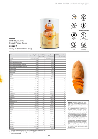 83GESUNDHEIT & ERN%u00c4HRUNGNAMELR FIGUACTIVESweet Potato SoupINHALT488 g (8 Portionen %u00e0 61 g)N%u00e4hrwerte pro 100 g Pulver % NRV** pro 100 gpro Portion (=1 Mahlzeit)% NRV**, pro Portion(=1 Mahlzeit)Energie 1549 kJ (368 kcal) 945 kJ (225 kcal)Fett 9,9 g 6,0 gdavon ges%u00e4ttigte Fetts%u00e4uren 2,2 g 1,3 gdavon einfach unges%u00e4ttigte Fetts%u00e4uren 1,8 g 1,1 gdavon mehrfach unges%u00e4ttigte Fetts%u00e4uren 5,7 g 3,5 gKohlenhydrate 30 g 18 gdavon Zucker 9,4 g 5,7 gBallaststoffe 13 g 7,9 gEiwei%u00df 33 g 20 gSalz 5,1 g 3,1 gVitamin A 556 %u03bcg 70 339 %u03bcg 42Vitamin D 3,3 %u03bcg 66 2,0 %u03bcg 40Vitamin E 8,1 mg 68 4,9 mg 41Vitamin C 59 mg 74 36 mg 45Thiamin 0,74 mg 67 0,45 mg 41Riboflavin 0,95 mg 68 0,58 mg 41Niacin 13 mg 81 8,0 mg 50Vitamin B6 0,97 mg 69 0,59 mg 42Fols%u00e4ure 189 %u03bcg 95 115 %u03bcg 58Vitamin B12 1,6 %u03bcg 64 0,98 %u03bcg 39Biotin 43 %u03bcg 86 26 %u03bcg 52Pantothens%u00e4ure 4,0 mg 67 2,4 mg 40Vitamin K 49 %u03bcg 65 30 %u03bcg 40Calcium 590 mg 74 359 mg 45Phosphor 824 mg 118 502 mg 72Kalium 1110 56 677 mg 34Eisen 8,7 mg 62 5,3 mg 38Zink 5,6 mg 56 3,4 mg 34Kupfer 011 mg 110 0,67 mg 67Jod 96,9 %u03bcg 65 59,1 %u03bcg 39Selen 48 %u03bcg 87 29 %u03bcg 53Magnesium 232 mg 62 141 mg 38Mangan 1,3 mg 65 0,79 mg 40Natrium 2051 mg *** 1251 mg ***Linols%u00e4ure 4,8 g *** 2,9 g ***Zutaten: Sojaeiwei%u00df-Isolat (31 %), Emulgator: Soja- Lecithine; K%u00fcrbispulver (8 %), S%u00fc%u00dfkartoffelpulver (8 %), Maltodextrin, Inulin (7 %), Br%u00fche (hydrolysiertes Maisprotein, Salz, Sonnenblumen%u00f6l), Erbsenprotein (4 %), Kartoffelflocken (4 %), Zwiebeln (4 %), nat%u00fcrliche Aromen, Lauch (3 %), Calciumcarbonat, Kaliumphosphat, Petersilie (1 %), Salz, Flohsamenschalenpulver (0,5 %), f%u00e4rbendes Lebensmittel: Rote Beete Saft Pulver; Magnesiumhydroxid, Kurkumawurzel-Extrakt, Verdickungsmittel: Guarkernmehl; schwarzer Pfeffer, Calciumphosphat, Vitamin C, Raps%u00f6l, Eisenpyrophosphat, Zinkoxid, Niacin, Vitamin E, Vitamin A, Pantothens%u00e4ure, Mangansulfat, Antioxidationsmittel: alpha-Tocopherol; Vitamin B6, Trennmittel: Siliciumdioxid; Kupfercarbonat, S%u00fc%u00dfungsmittel: Steviolglycoside aus Stevia; Riboflavin, Thiamin, Fols%u00e4ure, Natriumselenit, Vitamin K, Biotin, Natriumiodid, Vitamin D, Vitamin B12.GlutenFreiGLUTENFREILaktoseFreiLAKTOSEFREINAT%u00dcRLICHE Nat%u00fcrliche AROMENAromenHoher Proteingehalt*Hoher BallaststoffgehaltZuckerarmVeganLR BODY MISSION | LR FIGUACTIVE | Suppen* Proteine tragen zur Erhaltung und Zunahme der Muskelmasse bei.** der Referenzmenge f%u00fcr die t%u00e4gliche Zufuhr (NRV) *** Kein NRV verf%u00fcgbar