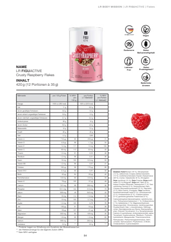 84GESUNDHEIT & ERN%u00c4HRUNGLaktoseFreiLAKTOSE- NAME FREILR FIGUACTIVECrusty Raspberry FlakesINHALT420 g (12 Portionen %u00e0 35 g)Zutaten: Haferflocken (18 %), Erbsenprotein (15 %), Vollkornreis-Crispies (Vollkornreismehl) (10 %), Zartbitterschokolade-Tropfen (Kakaomasse (48 %), Zucker, Kakaobutter (6 %), Emulgator: Soja-Lecithine) (10 %), Soja-Crispies (Sojaeiwei%u00dfIsolat (70 %),Reisgrie%u00df, Sojamehl, Salz) (9 %), Kakao-Crispies (Reismehl, Kakaopulver (7 %), Salz, nat%u00fcrliches Aroma) (5 %), Sonnenblumen-ReisCrispies (Sonnenblumeneiwei%u00df (75 %), Reismehl) (3 %), Mais-Dextrin, Emulgator: Soja-Lecithine; Ackerbohneneiwei%u00df-Isolat (2 %), Leinsamenmehl (2 %), Himbeerst%u00fccke (2 %), Cranberryst%u00fccke (2 %), ger%u00f6stete gehackte Haseln%u00fcsse (2 %), Calciumphosphat,Kaliumphosphat, nat%u00fcrliche Aromen, Flohsamenschalenpulver (1 %), Erdbeerst%u00fccke (1 %), Apfelst%u00fccke (1 %), Magnesiumhydroxid,S%u00e4uerungsmittel: Citronens%u00e4ure; Verdickungsmittel: Guarkernmehl; Salz, L-Ascorbins%u00e4ure, S%u00fc%u00dfungsmittel: Steviolglycoside aus Stevia; Eisenpyrophosphat, Zinkoxid, Nicotinamid, D-%u03b1-Tocopherylacetat, Calcium-D-pantothenat, Antioxidationsmittel: alphaTocopherol; Kupfercarbonat, Riboflavin, Pyridoxinhydrochlorid, Mangansulfat, Thiaminmononitrat, Retinylacetat, Pteroylmonoglutamins%u00e4ure, Natriumiodid, Natriumselenit, Phyllochinon, D-Biotin, Cholecalciferol, Cyanocobalamin.N%u00e4hrwerte pro 100 g Pulver % NRV1pro 100 gpro Portion(=1 Mahlzeit)2% NRV1pro Portion(=1 Mahlzeit)2Energie 1605 kJ (382 kcal) 925 kJ (220 kcal)Fett 11 g 6,0 gdavon ges%u00e4ttigte Fetts%u00e4uren 3,6 g 1,6 gdavon einfach unges%u00e4ttigte Fetts%u00e4uren 3,9 g 1,8 gdavon mehrfach unges%u00e4ttigte Fetts%u00e4uren 2,7 g 2,4 gKohlenhydrate 38 g 18 gdavon Zucker 8,6 g 4,8 gBallaststoffe 12 g 7,5 gEiwei%u00df 26 g 20 gSalz 1,5 g 0,66Vitamin A 716 %u03bcg 90 250 %u03bcg 31Vitamin D 4,8 %u03bcg 96 1,7 %u03bcg 34Vitamin E 14 mg 117 12 mg 100Vitamin C 90 mg 113 32 mg 40Thiamin 1,0 mg 91 0,53 48Riboflavin 1,2 mg 86 0,51 36Niacin 16 mg 100 8,3 mg 52Vitamin B6 1,2 mg 86 0,57 41Fols%u00e4ure 192 %u03bcg 96 175 %u03bcg 88Vitamin B12 2,3 %u03bcg 92 0,81 32Biotin 42 %u03bcg 84 20 %u03bcg 40Pantothens%u00e4ure 5,6 mg 93 2,0 mg 33Vitamin K 79 %u03bcg 105 37 %u03bcg 49Calcium 707 mg 88 286 mg 36Phosphor 1011 mg 144 510 mg 73Kalium 958 mg 48 845 mg 42Eisen 16 mg 114 7,3 mg 52Zink 10 mg 100 3,7 mg 37Kupfer 1,2 mg 120 0,76 76Jod 136 %u03bcg 91 54 %u03bcg 36Selen 59 %u03bcg 107 21 %u03bcg 38Magnesium 300 mg 80 168 mg 45Mangan 1,8 mg 90 1,2 mg 60Natrium 586 mg *** 262 mg ***Linols%u00e4ure 2,3 g *** 2,0 g ***NAT%u00dcRLICHE Nat%u00fcrliche AROMENAromenHoher Proteingehalt*Hoher BallaststoffgehaltZuckerarmVeganLR BODY MISSION | LR FIGUACTIVE | Flakes* Proteine tragen zur Erhaltung und Zunahme der Muskelmasse bei.** der Referenzmenge f%u00fcr die t%u00e4gliche Zufuhr (NRV) *** Kein NRV verf%u00fcgbar