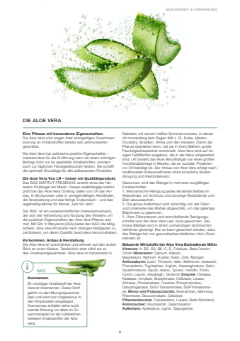 9GESUNDHEIT & ERN%u00c4HRUNGiAcemannan Ein wichtiger Inhaltsstoff der Aloe Vera ist Acemannan. Dieser Stoff geh%u00f6rt zu den Mucopolysacchariden und wird vom Organismus in den K%u00f6rperzellen eingelagert. Acemannan entfaltet seine wohltuende Wirkung vor allem im Zusammenspiel mit den zahlreichen weiteren Inhaltsstoffen der Aloe Vera. INFODIE ALOE VERAEine Pflanze mit besonderen Eigenschaften:Die Aloe Vera wird wegen ihrer einzigartigen Zusammensetzung an Inhaltsstoffen bereits seit Jahrhunderten gesch%u00e4tzt.Die Aloe Vera hat zahlreiche positive Eigenschaften %u2013 insbesondere f%u00fcr die Ern%u00e4hrung kann sie einen wichtigen Beitrag nicht nur an speziellen Inhaltsstoffen, sondern auch zur t%u00e4glichen Fl%u00fcssigkeitszufuhr leisten. Sie schafft die optimale Grundlage f%u00fcr alle aufbauenden Produkte.Die Aloe Vera Von LR %u2013 immer ein Qualit%u00e4tsprodukt. Das SGS INSTITUT FRESENIUS verleiht eines der h%u00e4rtesten Pr%u00fcfsiegel am Markt. Dieses unabh%u00e4ngige Institut pr%u00fcft bei den Aloe Vera Drinking Gelen von LR den Anbau, in Stichproben oder in unregelm%u00e4%u00dfigen Abst%u00e4nden, die Verarbeitung und das fertige Endprodukt %u2013 und das regelm%u00e4%u00dfig Monat f%u00fcr Monat, Jahr f%u00fcr Jahr! Der IASC ist ein wissenschaftlicher Interessenverband, der sich der Verbreitung und Nutzung des Wissens um die positiven Eigenschaften der Aloe Vera Pflanze widmet. Mit Sitz in Maryland (USA) bietet der IASC die M%u00f6glichkeit, Aloe Vera Produkte nach strengen Ma%u00dfgaben zu zertifizieren, um deren Qualit%u00e4t besonders hervorzuheben.Vorkommen, Anbau & HerstellungDie Aloe Vera ist unscheinbar und erinnert auf den ersten Blick an einen Kaktus. Tats%u00e4chlich aber z%u00e4hlt sie zu den Grasbaumgew%u00e4chsen. Aloe Vera ist beheimatet in Gebieten mit extrem hei%u00dfen Sommermonaten, in denen oft monatelang kein Regen f%u00e4llt z. B.: Kuba, Mexiko (Yucatan), Brasilien, Afrika und den Kanaren. Damit die Pflanze %u00fcberleben kann, hat sie in ihren Bl%u00e4ttern gro%u00dfe Feuchtigkeitsspeicher entwickelt. Aloe Vera wird auf riesigen Feldfl%u00e4chen angebaut, die in die Natur eingebettet sind. LR bezieht das Aloe Vera Blattgel von einer gro%u00dfen Hochlandplantage in Mexiko, die an sozialen Projekten vor Ort beteiligt ist. Der Anbau von Aloe Vera erfolgt nach traditionellen Anbaumethoden ohne k%u00fcnstliche Bodend%u00fcngung und Pestizideinsatz. Gewonnen wird das Blattgel in mehreren sorgf%u00e4ltigen Einzelschritten:1. Mechanische Reinigung jedes einzelnen Blattes im Wasserbad, um Schmutz und sonstige R%u00fcckst%u00e4nde vomBlatt abzuwaschen.2. Die gr%u00fcne Au%u00dfenhaut wird vorsichtig von der Oberund Unterseite des Blattes abgesch%u00e4lt, um das gelartige Blattinnere zu gewinnen.3. %u00dcber Filterpressen und anschlie%u00dfende Reinigungsschritte wird der Aloe Vera Leaf Juice gewonnen. Das innere Blattgel wird in einem aufw%u00e4ndigen technischen Verfahren gereinigt. Nur so kann garantiert werden, dass das Blattgel frei von gesundheitssch%u00e4dlichen Aloin-R%u00fcckst%u00e4nden ist.Bekannte Wirkstoffe der Aloe Vera Barbadensis MillerVitamine: A, B2, B3, B6, C, E, Fols%u00e4ure, Beta Carotin, Cholin Mineralien: Calcium, Kalium, Magnesium, Natrium, Kupfer, Eisen, Zink, Mangan Aminos%u00e4uren: Lysin, Threonin, Valin, Methionin, Isoleucin, Phenylalanin, Tryptophan, Arginin, Asparagins%u00e4ure, Serin, Glutamins%u00e4ure, Glycin, Alanin, Tyrosin, Histidin, Prolin, Cystin, Leucin, Asparagin, Glutamin Enzyme: Oxidase, Katalase, Amylase, Bradykinase, Cellulase, Lipase, Alliinase, Phosphatase, Creatine-Phosphokinase, Dehydrogenase, SGO-Transaminase, SGPTransaminase, Mono-und Polysaccharide: Acemannan, Mannose, Rhamnose, Glucurons%u00e4ure, Cellulose Pflanzensteorole: Campesterol, Lupeol, Beta-Sitosterol, Aminozucker: Glucosamin, Galactosamin Au%u00dferdem: Apfels%u00e4ure, Lignin, Sapogenine